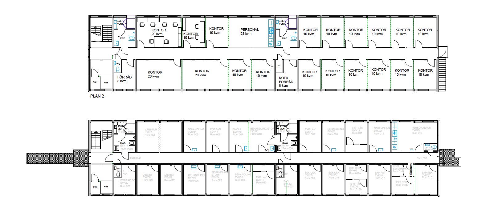 Til Östra Hospitalet blev der opført specialmoduler for at imødekomme kravene, men de er i udgangspunktet baseret på Expandias K2000‑moduler. De to bygninger består i alt af 26 moduler i to etager og har facadeplader i gråt kompositmateriale for at passe ind med de øvrige bygninger i området.